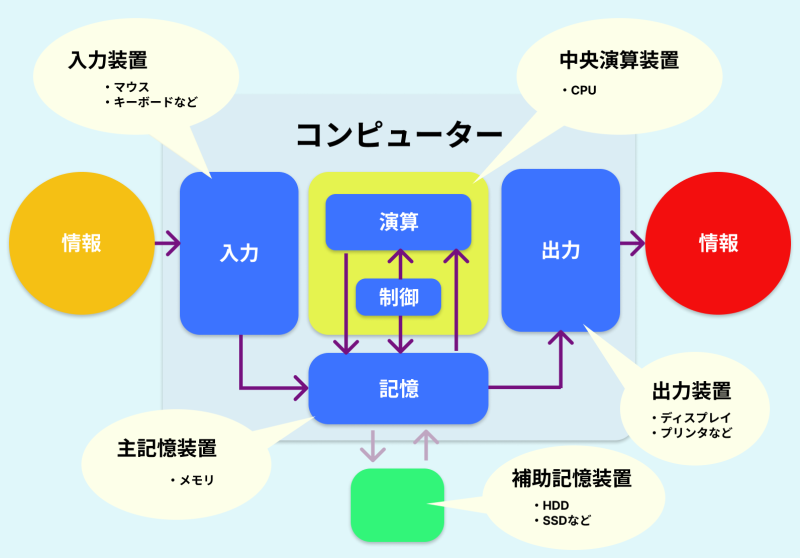 | 入力 | 外部からコンピュータにデータや命令を入力 | キーボード、マウスなど |