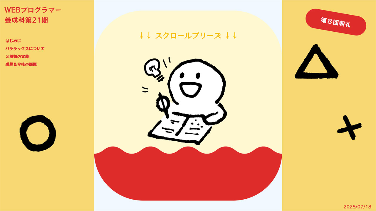 スクールの朝礼課題で、基本的なコーディングの練習としてシングルページサイトを制作しました。約10分ほどの発表資料として使用。