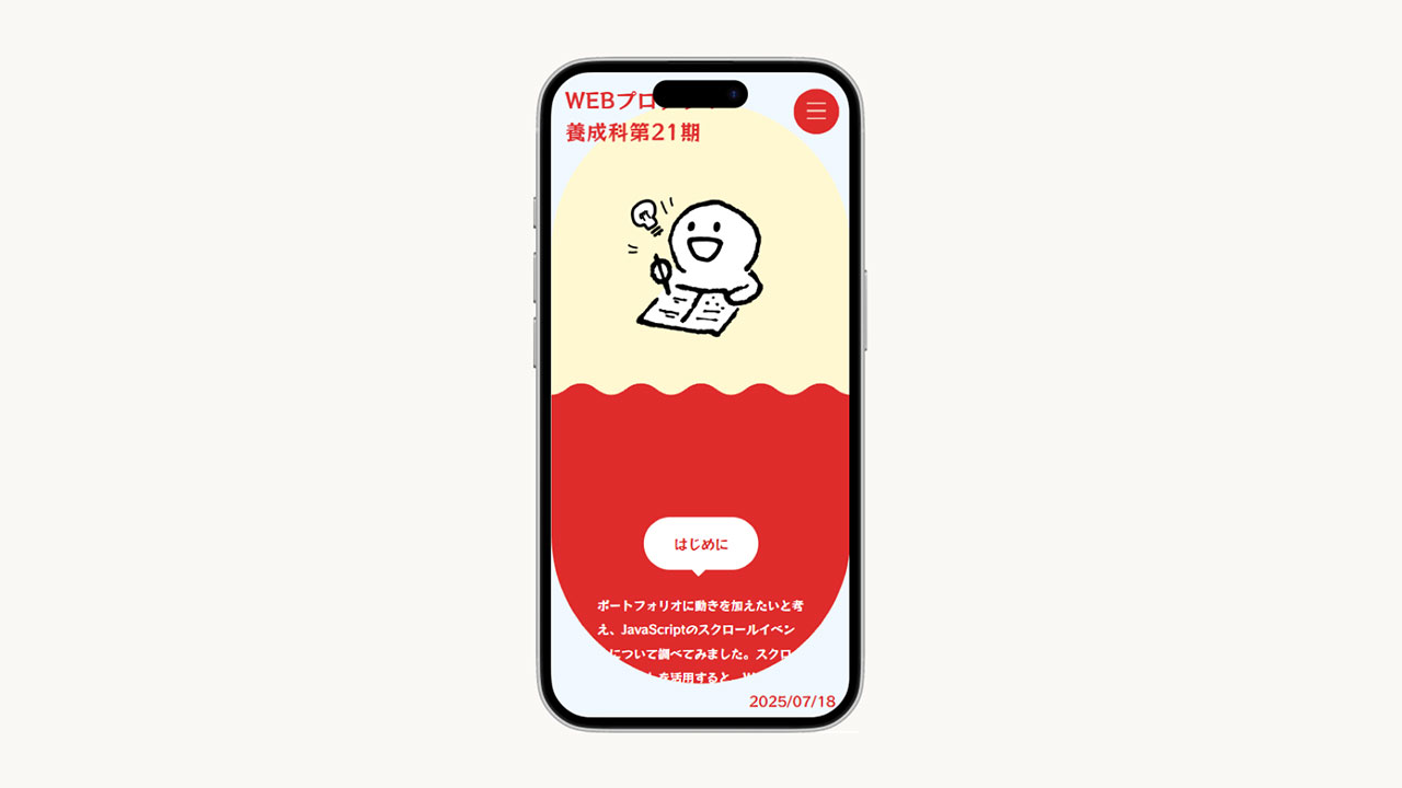 JavaScriptとアニメーションライブラリGSAPを用い、3種類の異なる実装パターンをデモンストレーションしました。検証の結果、「過剰な動きによる情報伝達の妨げ」というデメリットを認識。最終的なポートフォリオではユーザーへの伝わりやすさを優先し、この機能の採用は見送りました。